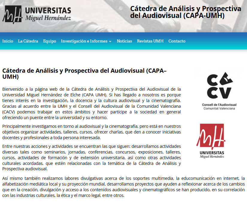 La Cátedra de Análisis y Prospectiva del Audiovisual de la Universidad Miguel Hernández de Elche (CAPA UMH) presenta su web institucional, https://catedracapa.umh.es/, en la que se difunde contenidos de investigación, actividades y eventos. CAPA UMH investiga en torno al audiovisual y la cinematografía, organiza actividades, talleres, cursos, ofrece charlas, que dan a conocer iniciativas docentes y profesionales a toda persona interesada. Entre sus acciones y actividades se encuentran las que siguen: desarrolla actividades diversas tales como seminarios, jornadas, conferencias, concursos, exposiciones, talleres, cursos, actividades de formación y de extensión universitaria, así como otras actividades culturales acordadas, que estén relacionadas con la temática de la Cátedra de Análisis y Prospectiva audiovisual.