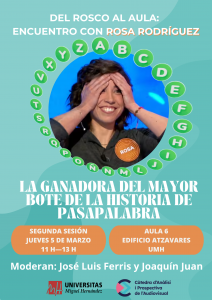 La UMH acogerá los próximos 4 y 5 de marzo la visita de Rosa Rodríguez, ganadora del mayor bote de la historia del concurso televisivo Pasapalabra, con un premio de 2.716.000 euros tras 307 programas de participación. Su victoria se convirtió en un auténtico fenómeno mediático, logrando un 36,8 % de cuota de pantalla y 3.696.000 espectadores en Antena 3. En el encuentro los asistentes podrán participar de una actividad centrada en el análisis de los formatos televisivos, la divulgación del conocimiento, la cultura general y el impacto mediático de la televisión contemporánea.
